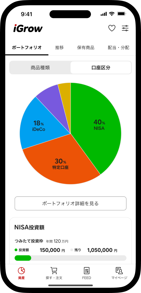 口座区分ごとの保有商品と、NISAの利用状況がひと目でわかる。