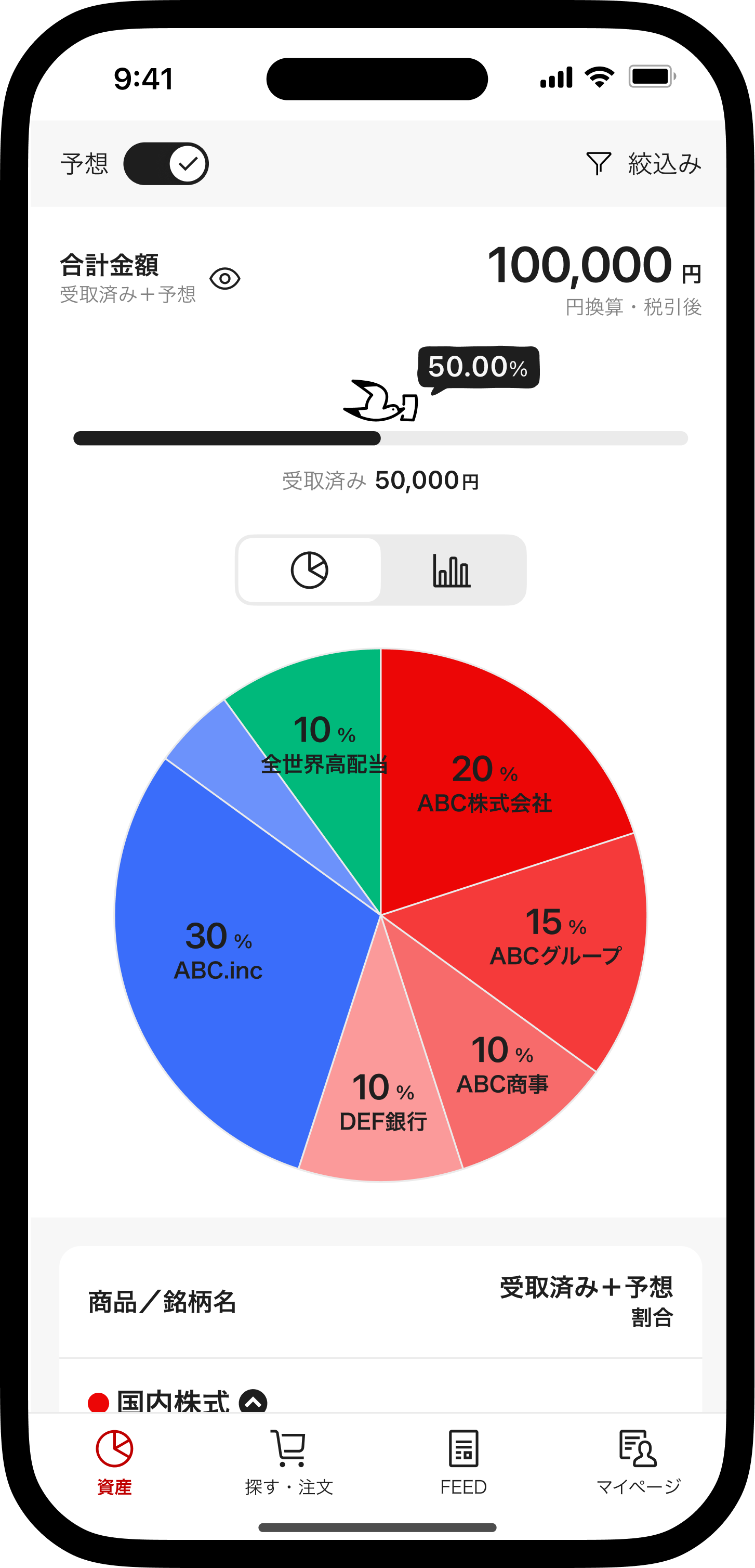 株式の配当金、投資信託の分配金、債券の利金の受取額と予想額がひと目で確認できる。